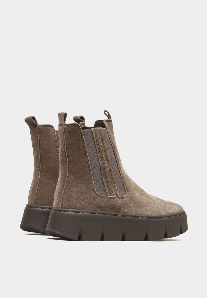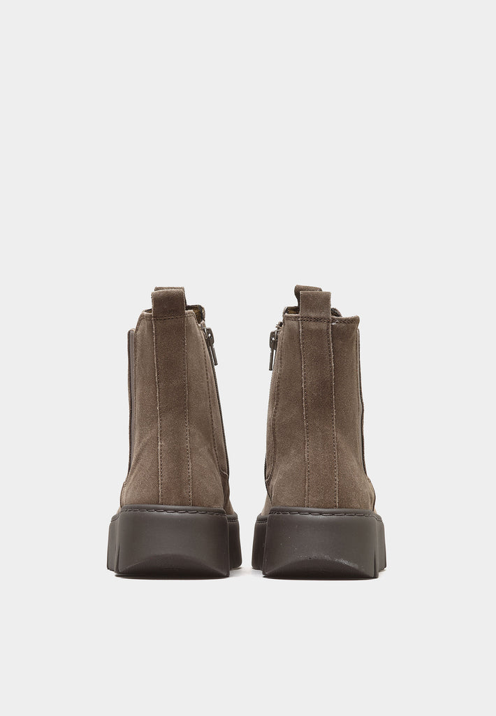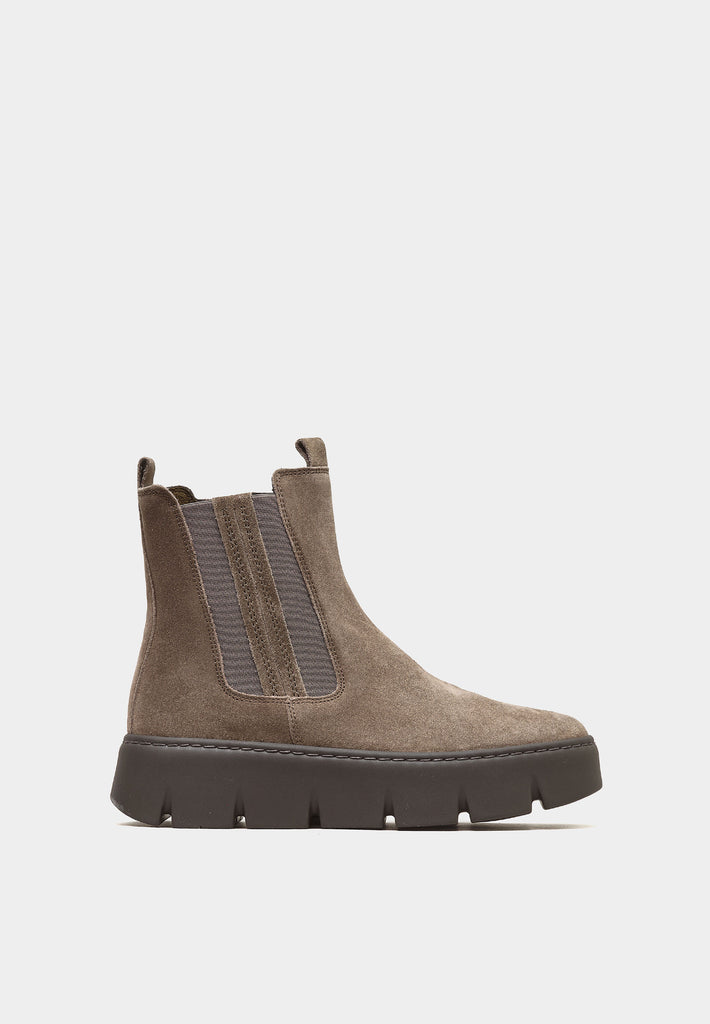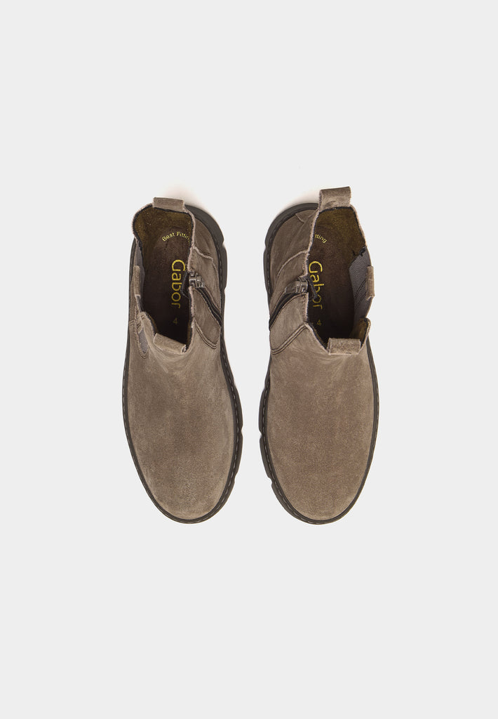 Introducing the 53-743 by Gabor, where modern elegance meets everyday practicality. Envision yourself slipping into these light taupe faux suede beauties – they're not just boots, they're a statement. With a sporty Chelsea boot design and a chunky sole that provides both height and comfort, these boots make every step feel like a walk on clouds. The side zip and elasticated panels ensure a snug fit without the struggle, while the heel pull adds a touch of convenience, getting you ready in a jiffy. Imagine pairing these with your favourite denim or chunky knits for a classical modern look that turns heads without shouting for attention. Whether you're strolling through city streets, country lanes or browsing art exhibits, these boots will complement your lifestyle perfectly. Plus, the brown rubber sole provides grip on any adventure. Make these boots your go-to for an effortless style that embraces life's adventure.