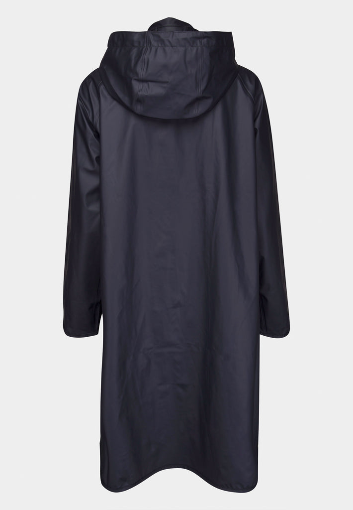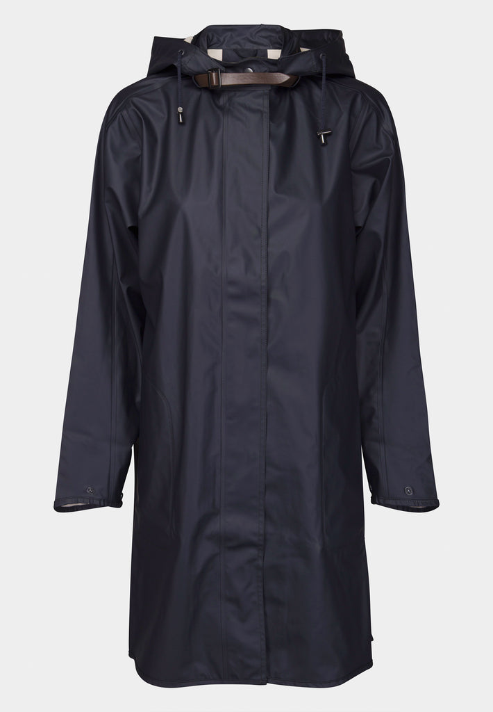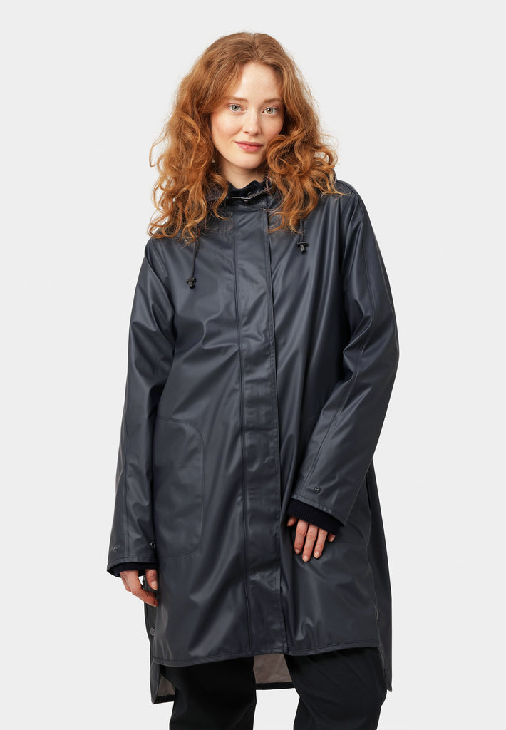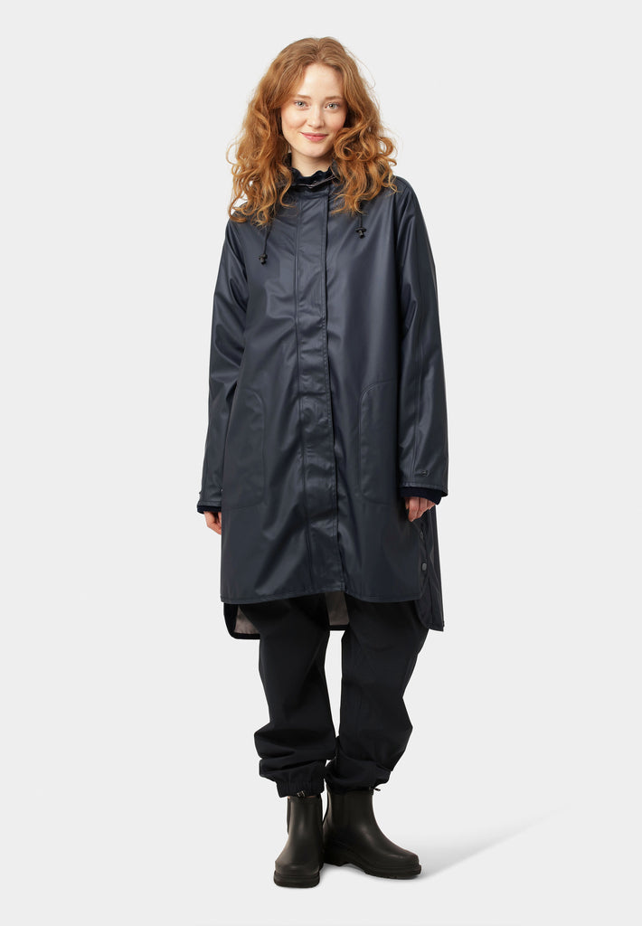 Stay dry in style with the Ilse Jacobsen Rain71 women’s raincoat in Dark Indigo – a perfect blend of Scandinavian design and weather-ready performance. Crafted from lightweight, waterproof rubberized PU, this A-line silhouette coat features a soft tricot lining for comfort all year round. With a 5000 MM water column pressure rating, it offers reliable medium rain protection, while the detachable hood, adjustable cuffs, and side seam pockets with protective flaps bring practical function to every detail. The two-way YKK zipper and hidden press buttons ensure a sleek finish, and side slits add mobility – ideal for both urban commutes and countryside walks. Perfect for layering over your everyday outfit, this ladies' waterproof coat is a must-have in any modern wardrobe.