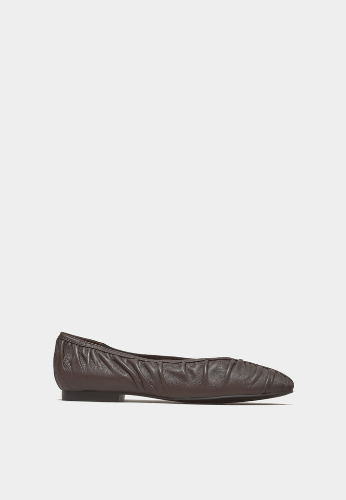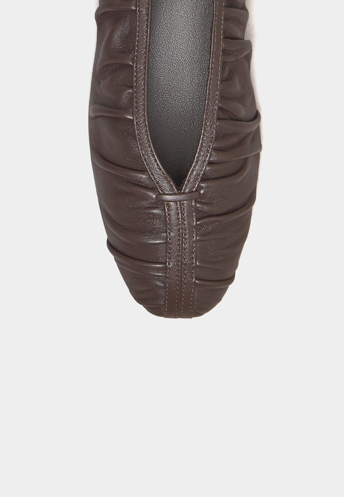 - Ruched brown leather upper – soft, flexible and timelessly chic