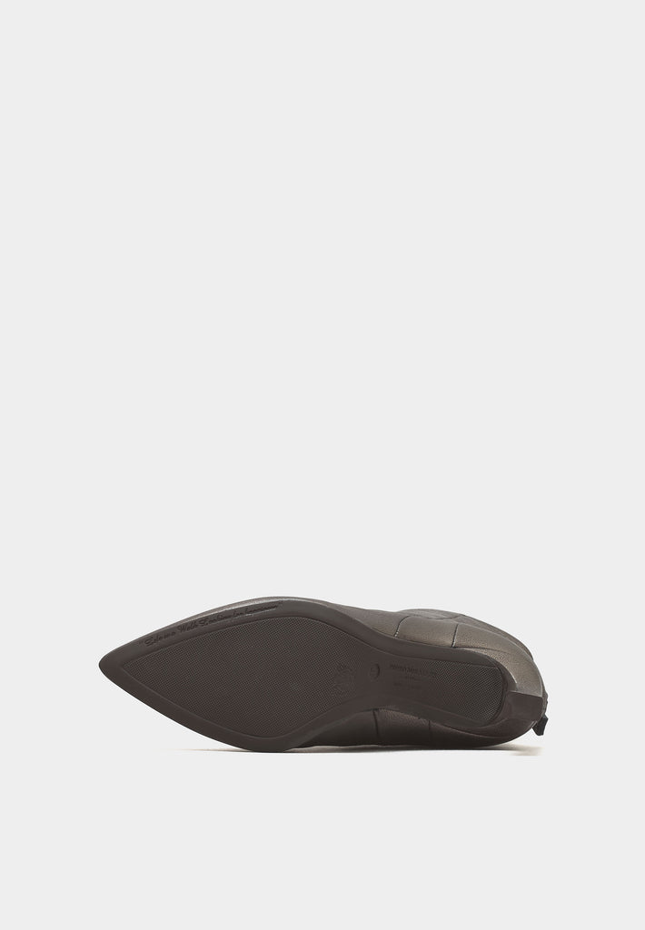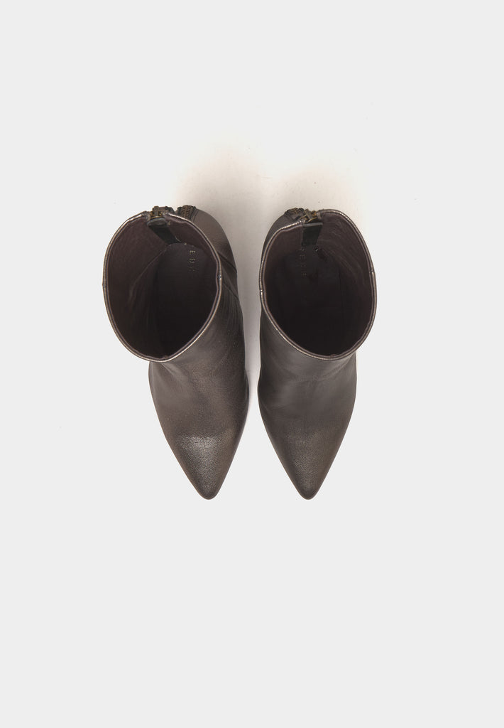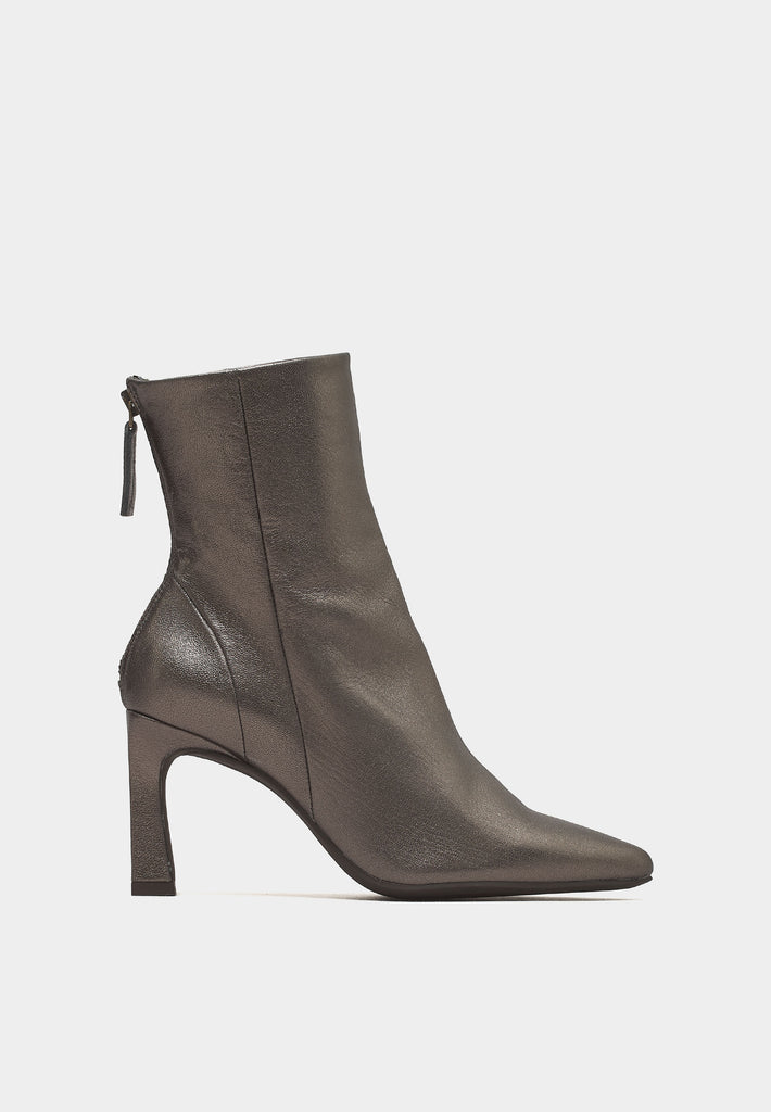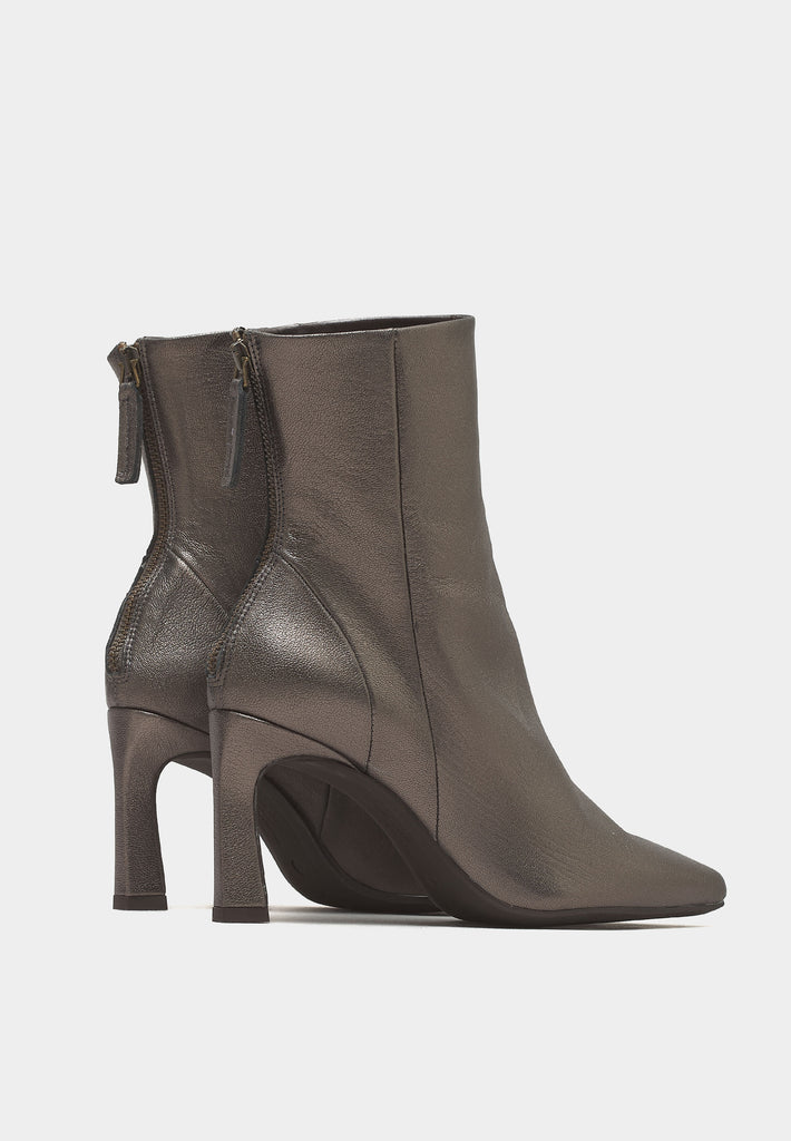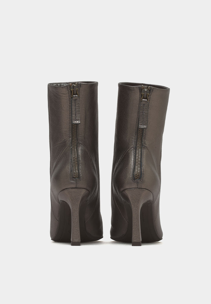 The metallic leather's subtle shimmer adds a chic touch, beautifully complementing the bold 8.5 cm high heel. Designed to fit closely around the ankle, these boots refine your silhouette, while the pointed toe offers a sharp, polished look. A convenient back zip closure ensures easy wearability, and the black rubber sole provides both durability and style—ideal for city strolls or exclusive soirées.