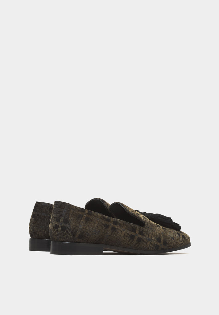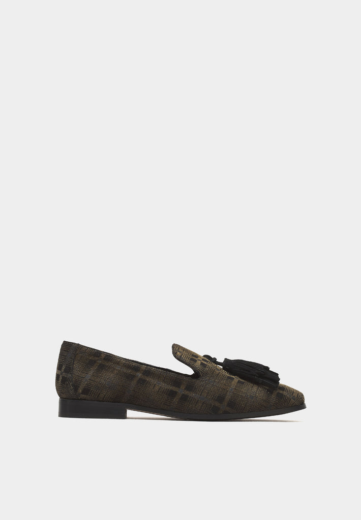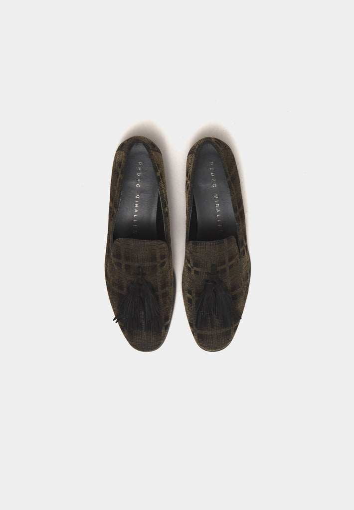 Add a touch of timeless charm to your wardrobe with the Alejandria 28001 by Pedro Miralles. Designed for the modern sophisticate, this slip-on loafer, featuring a striking black tartan with subtle gold shimmering filaments, offers an ideal blend of style and comfort., ensuring you’re effortlessly polished whether you're heading to brunch or a gallery opening.