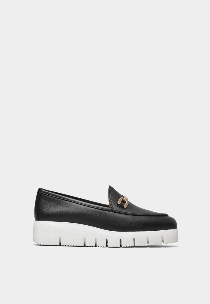 Enjoy the smart yet edgy style of our Famo Wedge Pumpsby Unisa. Crafted from luxuriously soft black Nappa leather, these pumps add a contemporary touch to your work wardrobe. The high contrast white wedge sole and classic gold horsebit buckle provide the perfect finishing touch for a sophisticated, timeless look. Step out looking chic and utterly refined.